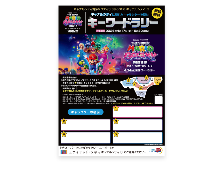 ユナイテッド・シネマ キャナルシティ13にて鑑賞された映画『ザ・スーパーマリオギャラクシー・ムービー』の半券チケットを館内に設置している応募用紙に添付して応募BOXに投函すると、抽選でオリジナルグッズをプレゼント♪